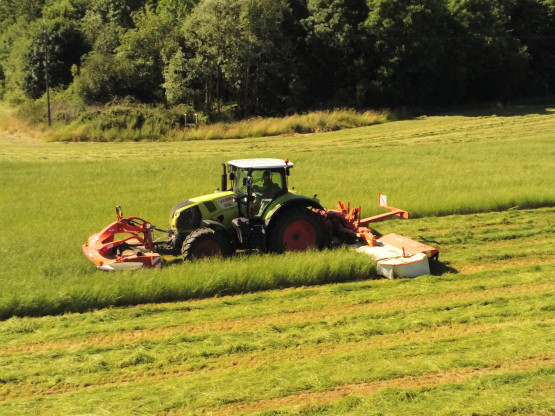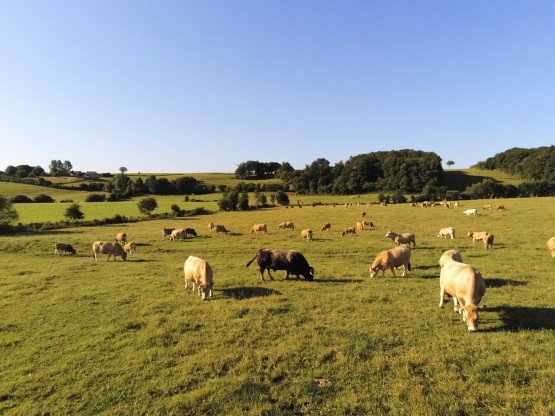 Leur nourriture est à 95% produite sur notre exploitation et EXCLUSIVEMENT issue de l’Agriculture Biologique. En effet, leur alimentation est constituée quotidiennement d’une quinzaine de végétaux de type fourragère différents comme des ray-grass, trèfles, dactyles, fétuques, lotiers et de multiples herbes sauvages comme des orties, pissenlit, oseille … Cette ration est apportée par les pâturages pendant les 8 mois de l’année où les animaux sont dans les prairies et l’hiver, elle est apportée sous forme de foin ou d’enrubannage.