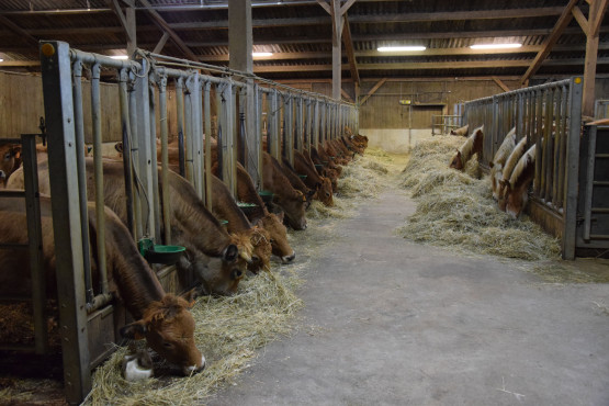 Chez nous, environ 200 animaux vivent en toute quiétude 8 mois de l’année en estive dans de grands pâturages. Ils sont rentrés en grande stabulation les 4 mois d’hiver pour ne pas subir les intempéries. A l’automne, environ 50 veaux naissent et restent toute leur vie à la ferme.
